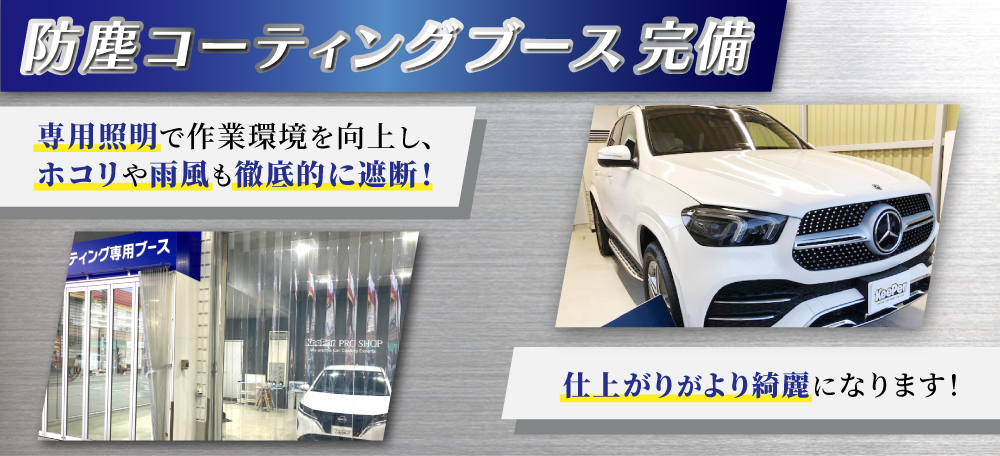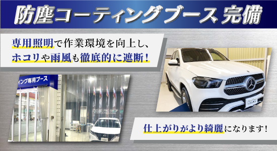 広島植物園店は専用の防塵コーティングブースを完備しており、細かい埃や日光を遮断した環境下で作業を実施いたします!