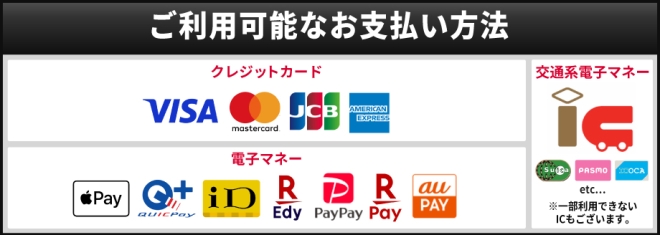お支払いは現金の他、各種カード、アップルペイ・クイックペイ・iD・交通系IC・楽天Edyもお使いいただけます!